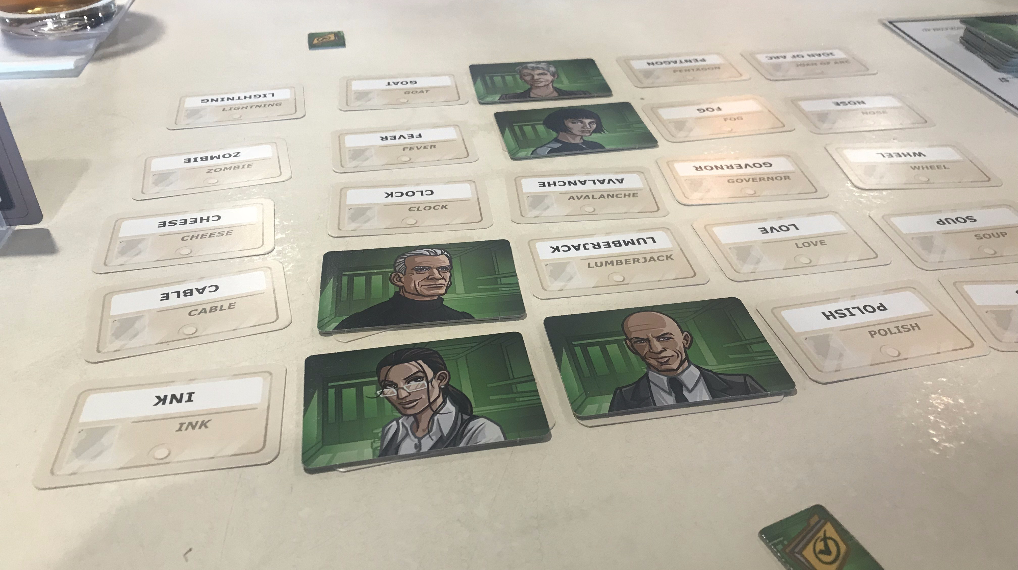 The timer tokens also serve as Bystander identity cards, although they’re slightly different to the ones in Codenames, as they don’t entirely cover the words on the codenames cards. Rather, they cover part of the card and have an arrow which I placed pointing towards the player who guessed incorrectly.