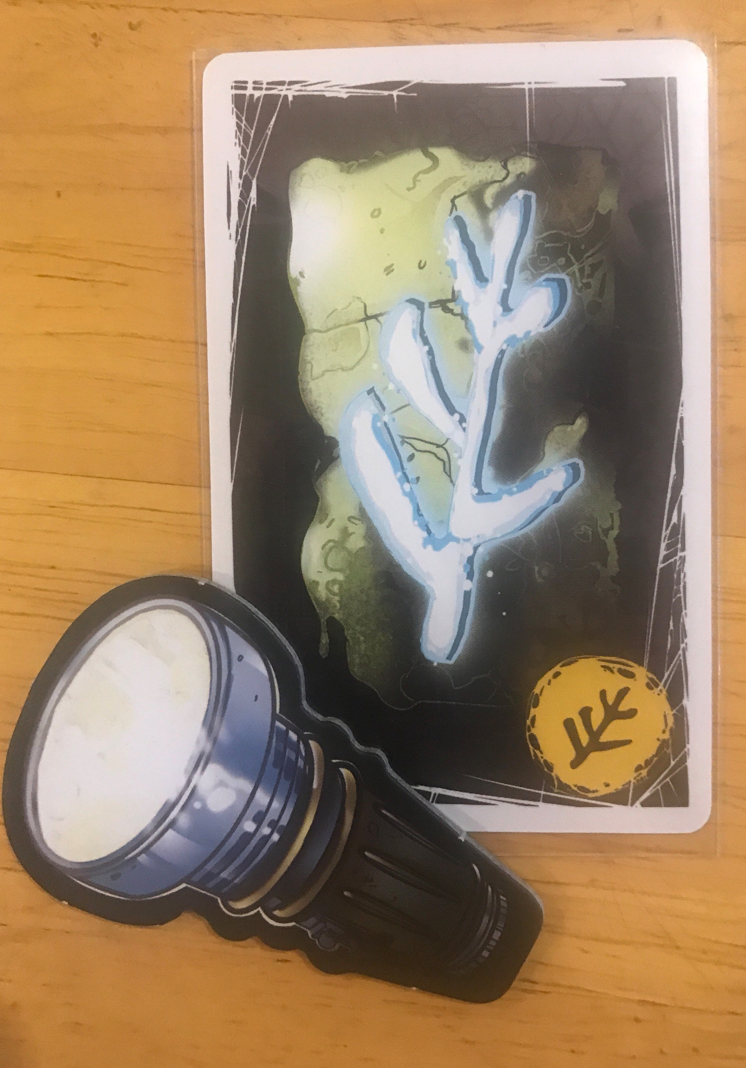 Regardless of how much deception you decide to employ, the player with the flashlight then chooses which card to investigate by placing the flashlight on a card in front of another player. Everyone holds their breath. Then the card is revealed. If it’s Cthulhu, the cultists win immediately, otherwise the investigated card gets placed in the center of the table, either a waste of the investigator’s precious time, or an Elder Sign that will bring them one step closer to victory.
