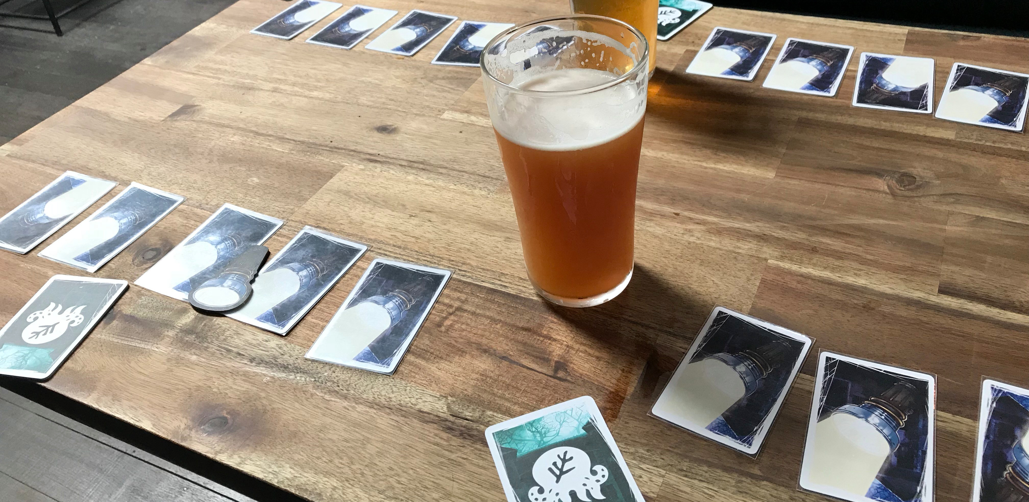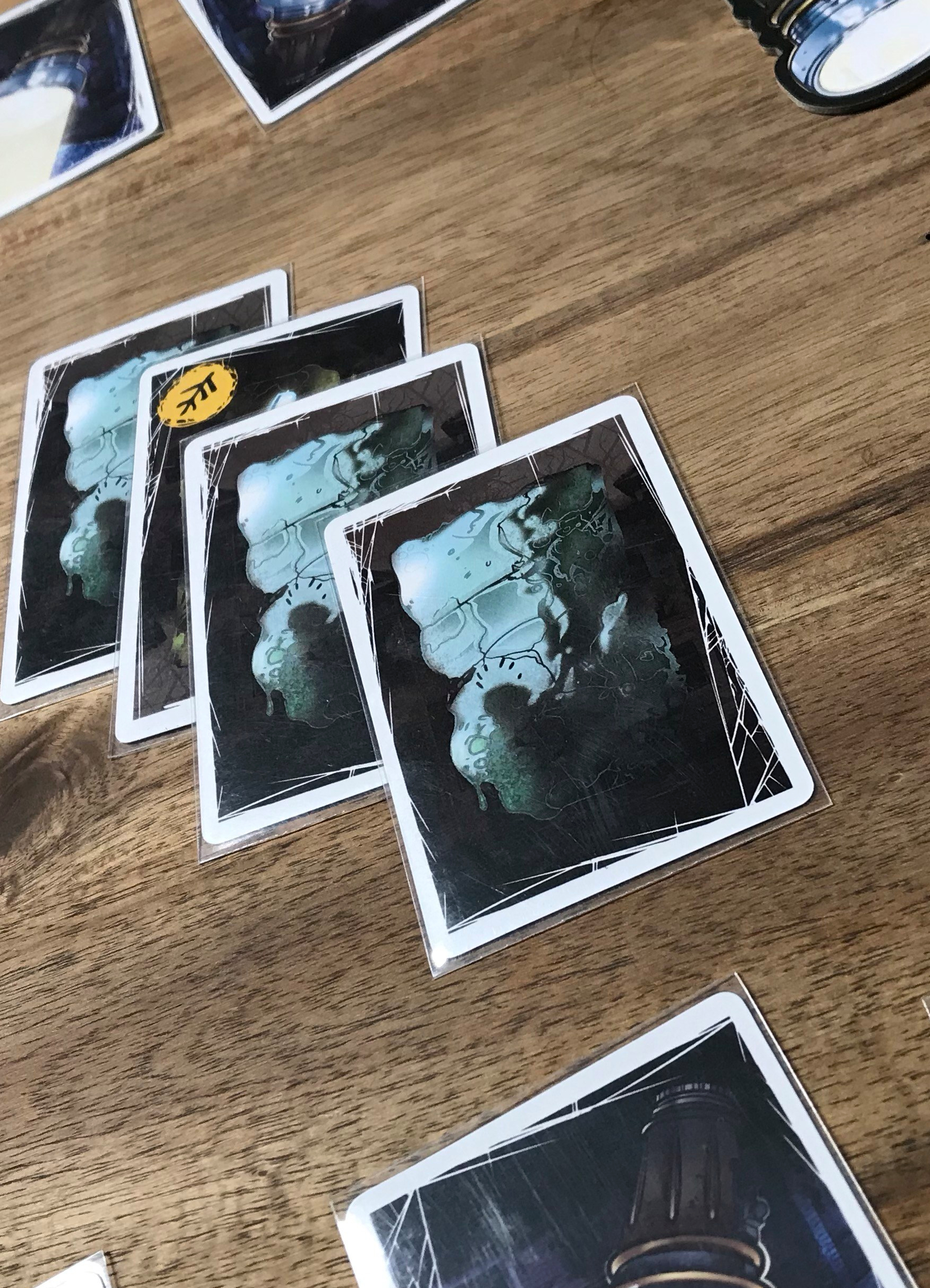 The person who now has the flashlight then selects a card to investigate until there’s a number of cards equal to the number of players in the middle of the table. Then the remaining cards are gathered up, shuffled, and four cards are dealt in front of each player.
